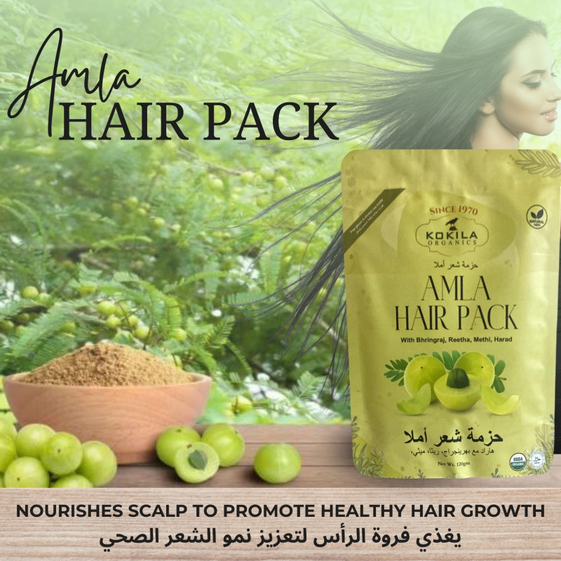 Kokila Organics Amla Hair Pack nourishes scalp to promote healthy hair growth. This 120g pack contains pure amla (Indian Gooseberry) with Bhringraj, Reetha, Methi, and Harad. Since 1970 formula provides deep nourishment, strengthens hair follicles, prevents premature greying, reduces dandruff, and adds natural shine. Amla is rich in vitamin C and antioxidants that revitalize hair and scalp. Organic, vegan, and 100% natural product. Mix with water to form paste, apply to hair and scalp, massage gently, leave for 20-30 minutes, wash with lukewarm water.